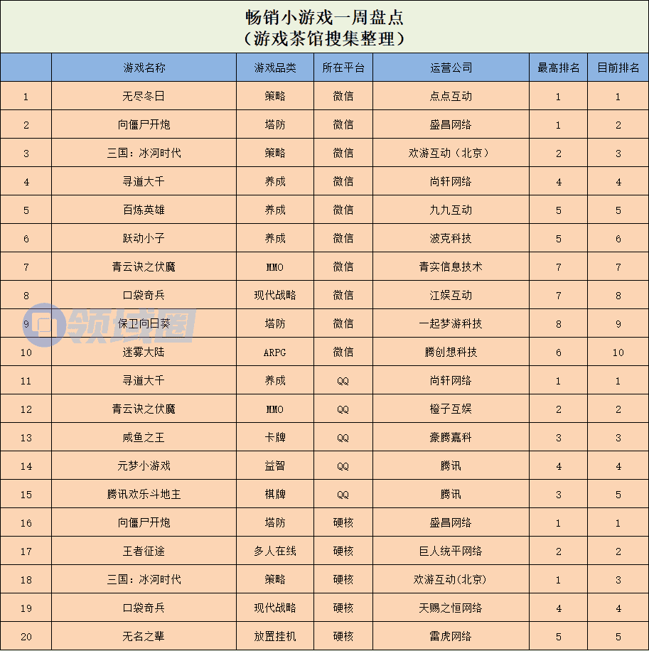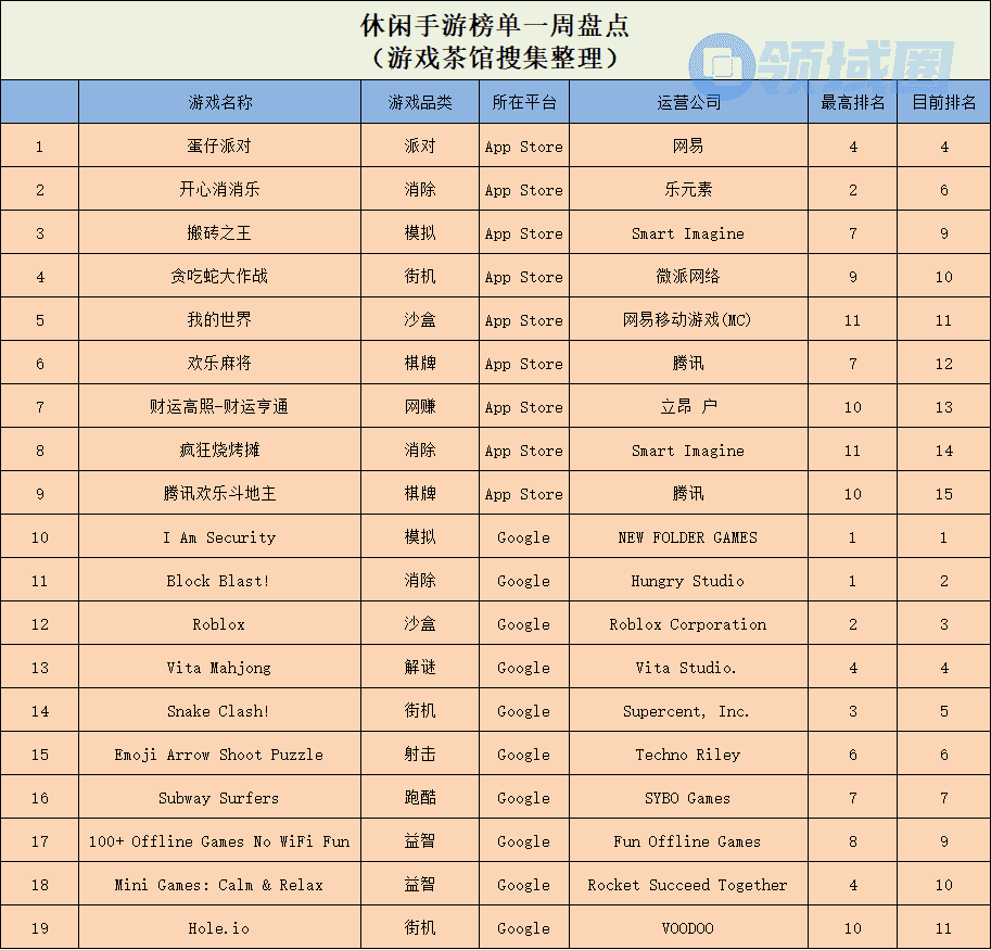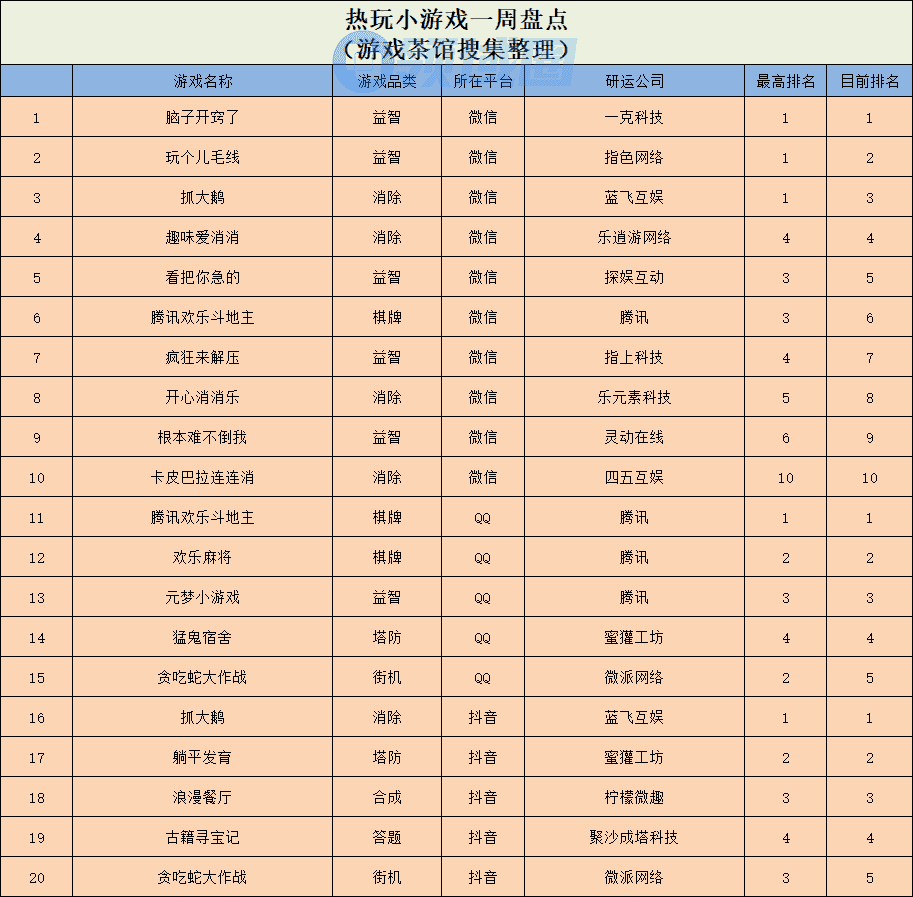 休闲新游周报每周统计微信小游戏、QQ小游戏、抖音小游戏、硬核小游戏以及App Store和Google Play上的新游爆款,并按照分类制作表格,将游戏排名情况等信息进行整理,希望给到行业同侪帮助。