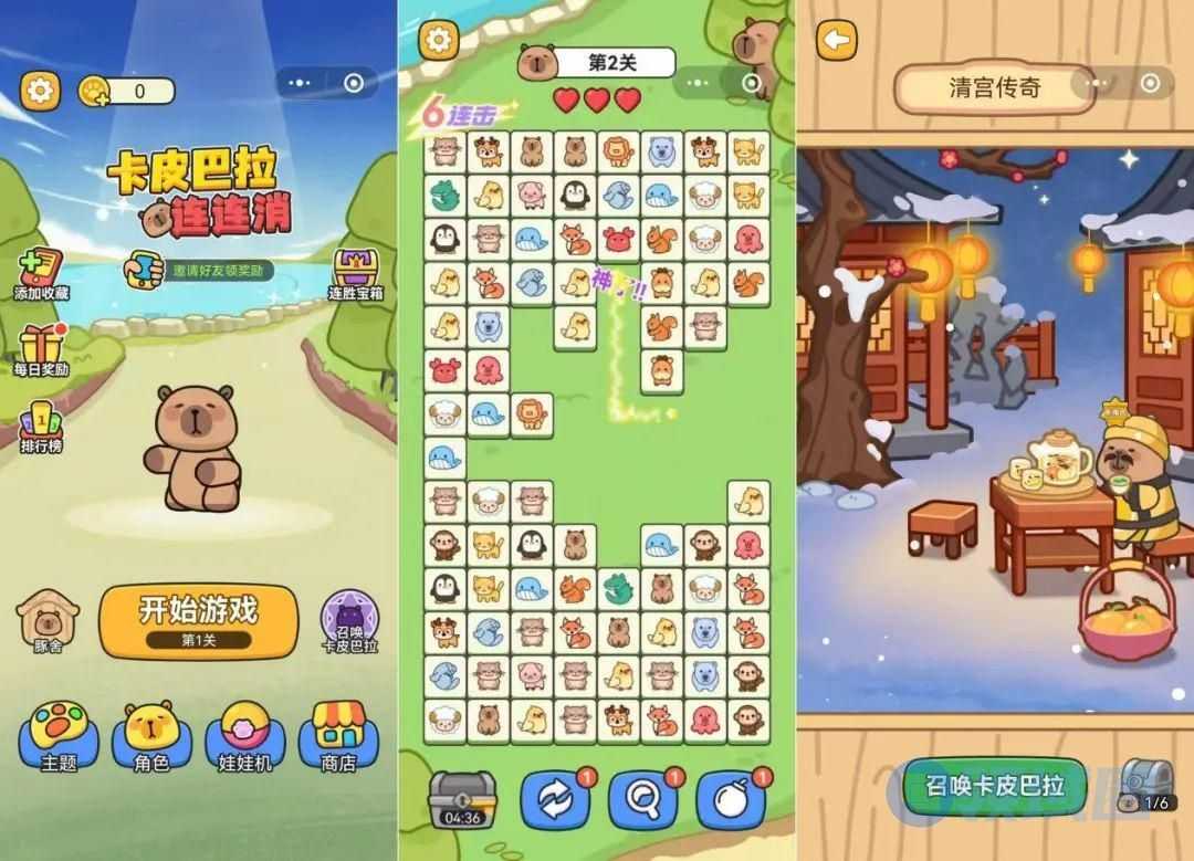 《卡皮巴拉连连消》则是经典的连线消除玩法,玩家需要匹配界面中相同的卡片,当卡片之间可以进行直线连接即可消除。这种经典玩法由来已久,该游戏将传统玩法与大热的“卡皮巴拉”题材相结合,给游戏套上了一层可爱的包装,并以此成功提升了游戏的获量效果。