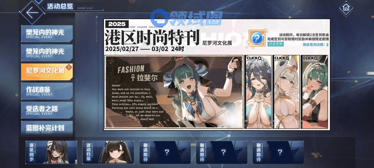 从2月27日维护后至3月2日23:59,《碧蓝航线》开启特别文化主题换装活动「港区时尚特刊:尼罗河文化展」。活动期间,每日解锁2次签到机会,玩家可在拉斐尔-「爱与美的秘密珍藏」、济安-「异域绮梦」、斯库拉-「侍女的裁决」、巴拉卡少校-「死亡之神的戏谑」4个换装中进行签到,完成签到便可获取限时奖励「外观装备箱(黄金法老的密器)」并解锁对应换装的限定剧情。