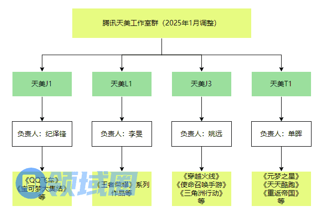 经过调整后,腾讯天美工作室此次经由整合的部门如下(并非天美工作室群的整体架构):