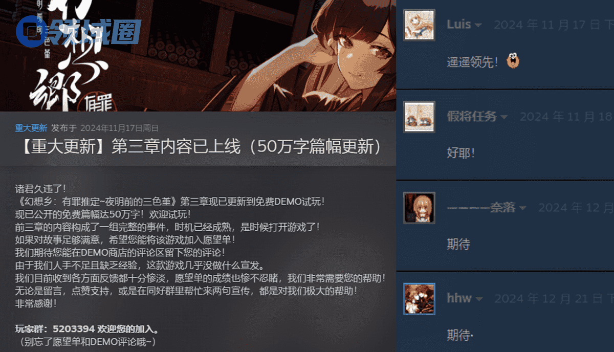 制作组的七年诚意: 《幻想乡:有罪推定~夜明前的三色堇》是戏壤游戏工作室的处女作,团队以“不计成本打磨剧情”为信条,将半数内容免费开放试玩。尽管作为独立团队的首部作品仍存在优化空间,但制作组已承诺根据玩家反馈持续完善,力求在正式版中呈现更极致的悬疑体验。