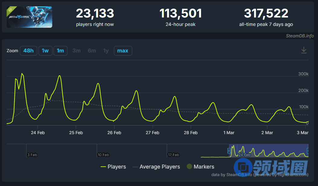 SteamDB数据显示,截至今日,《解限机》二测的在线用户峰值达三十余万,而且日均曲线也相当健康,基本每天都有一个一二十万在线的波峰。