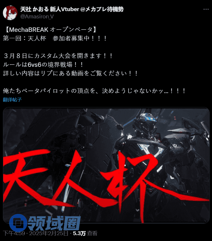 甚至已经有以Vtuber为首的日本机甲爱好者社团开始自发组织起《解限机》民间赛事了,赛事名称叫“天人杯”,很明显是在neta《机动战士高达00》中的“天人组织”。
