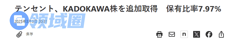 日本经济新闻3月3日报道,腾讯已通过额外收购的形式,增持日本角川公司1.11%的股份,此次收购后,腾讯对角川的持股比例达7.97%。