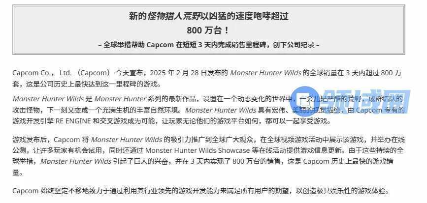 3天狂卖800万套,褒贬不一的《怪物猎人:荒野》依旧赚麻了