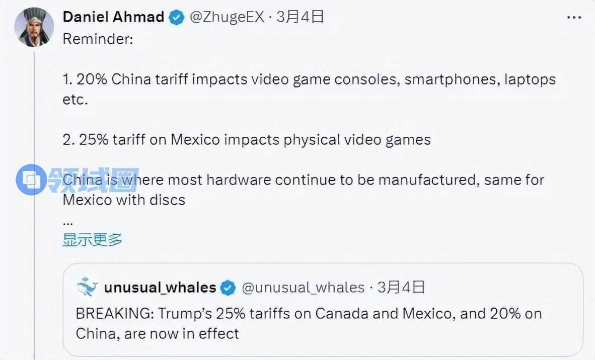 海外分析师Daniel Ahmad 近日在X上指出,中国商品的关税将影响游戏主机、智能手机、GPU以及笔记本电脑等产品,而墨西哥商品25%的关税将会冲击实体游戏的供应。