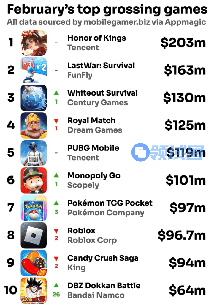 2月全球手游Top10榜单如下: