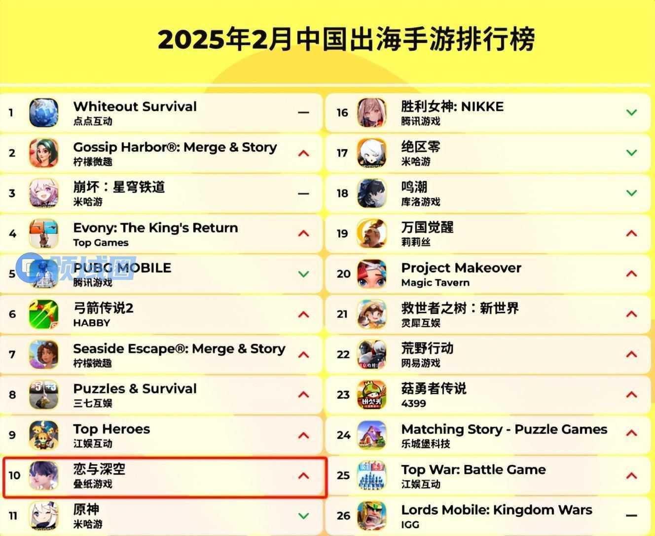 《恋与深空》也在2月全球收入Top20中新进入榜,赚取3040万美元。据AppMagic,2月10日情人节活动的开启,让其海外营收创造了上线以来的最高单日收入,最终2月在国产手游海外收入榜中跨入了Top10行列。