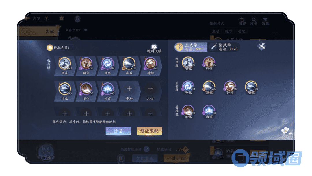 同时,在2.0版本中,我们加了一个重要的功能叫智能连招系统,玩家对于自己的连招链可以自由配置,AI就会通过玩家配置的连招链自动战斗。依赖智能连招系统,玩家能够打出非常高的输出,降低了自由武学所带来的操作要求。