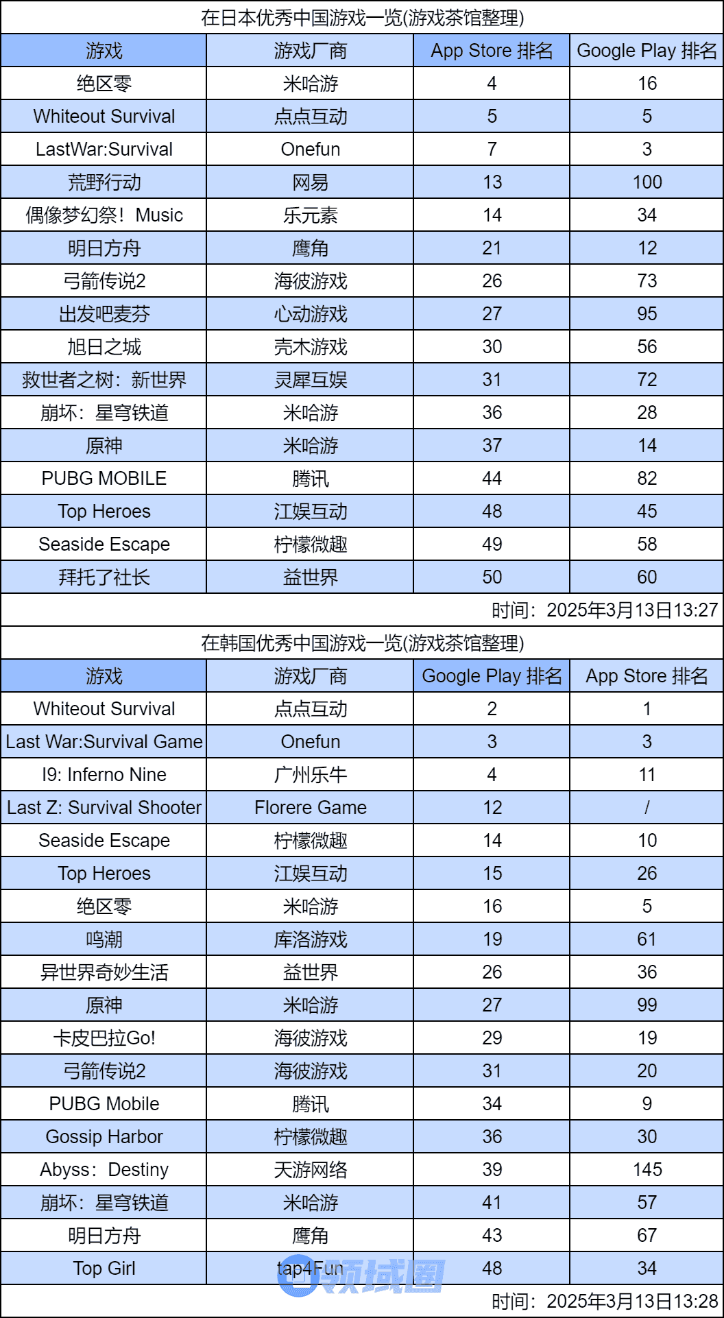 整理范围:日本App Store畅销榜及韩国Google Play畅销榜前50名