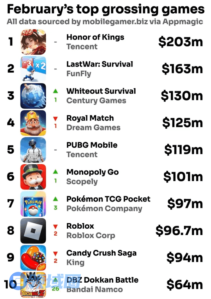 《Whitout Survival》不仅是出海之王,在全球收入榜单也名列前茅。在2月,随着情人节等活动的接连推出,《Whiteout Survival》2月海外收入保持稳定,在2月手游全球收入榜单排名第3,收入为1.3亿美元。据Sensor tower统计,上线两年以来,截至2月底,《Whiteout Survival》全球累计收入达到20.7亿美元。(国服《无尽冬日》在2024年6月上线)
