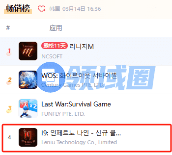 《I9: 인페르노 나인》(I9: Inferno Nine)是近期国产游戏的出海爆款,也引起了游戏行业的广泛关注。这款游戏是广州乐牛游戏在今年1月发行的一款MMO,目前仅在韩国地区发布。自1月上线以来,《I9:地狱九号》在韩国Google畅销榜一路直驱进Top5,仅次于韩国本土的经典MMO《天堂M》,成为一匹空降黑马。据点点数据显示,仅在韩国地区,截至3月11日,《I9: 인페르노 나인》上线49天达到1.9亿元人民币的IAP营收。