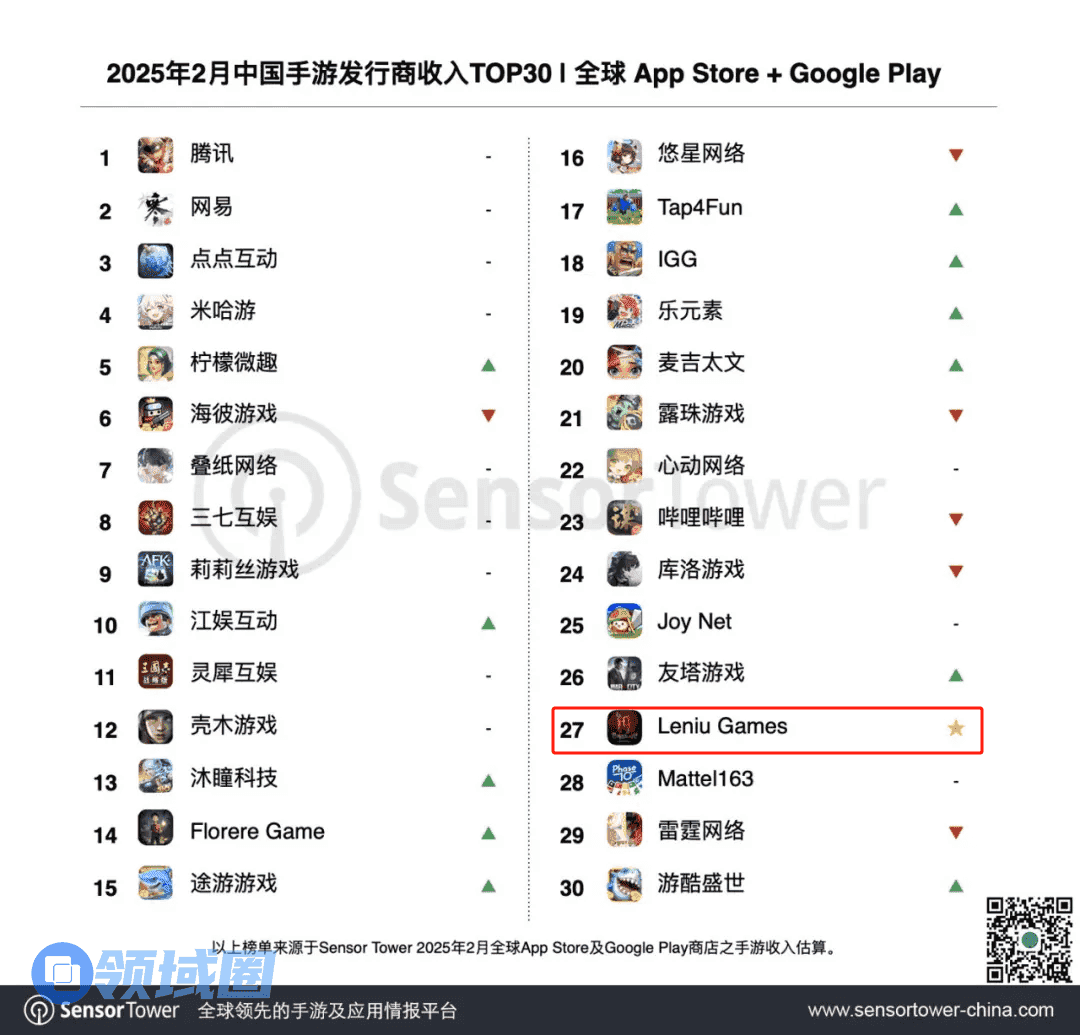 据Sensor Tower,《I9》登顶2月海外收入的增长榜,凭借这款游戏,广州乐牛2月的收入达到12月的3倍多,并首次入围中国手游发行商全球收入排行榜第27名。
