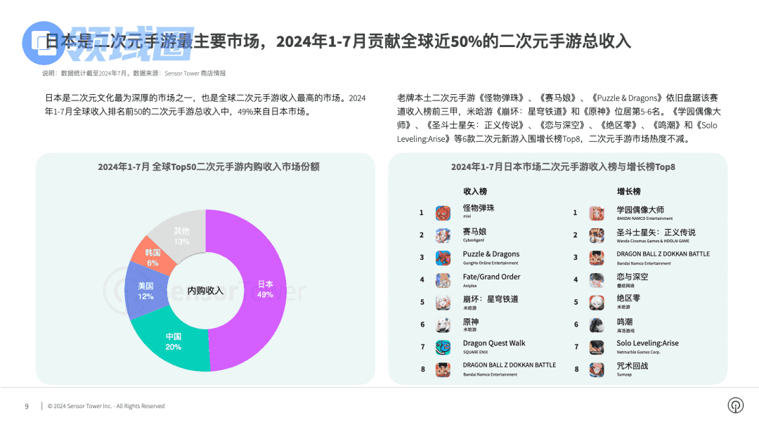 在日本地区,在2024年上半年,收入最高的手游仍旧来自本土手游《怪物弹珠》《赛马娘》等,日本也是全球二次元手游收入最高的地区。较为有趣的是,在日本逐渐式微的乙游环境中,《恋与深空》备受欢迎,还成为贡献收入最高的地区。
