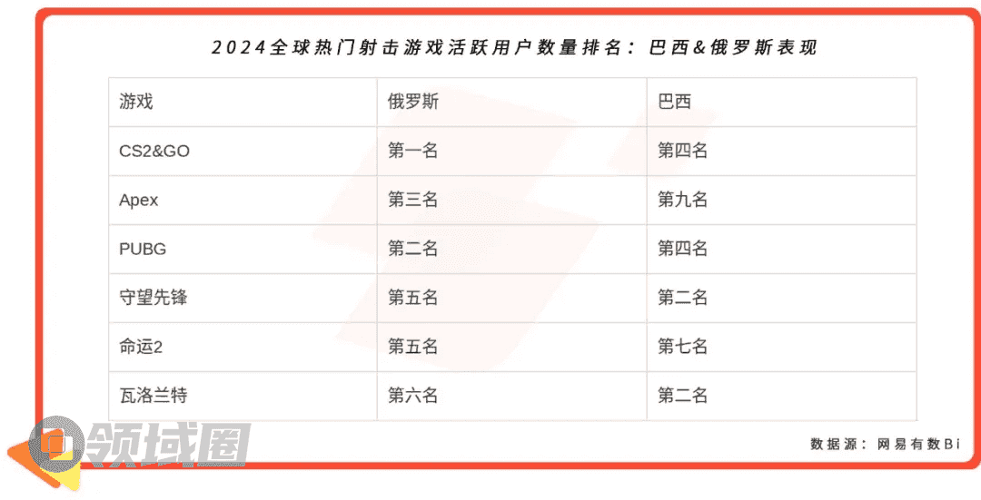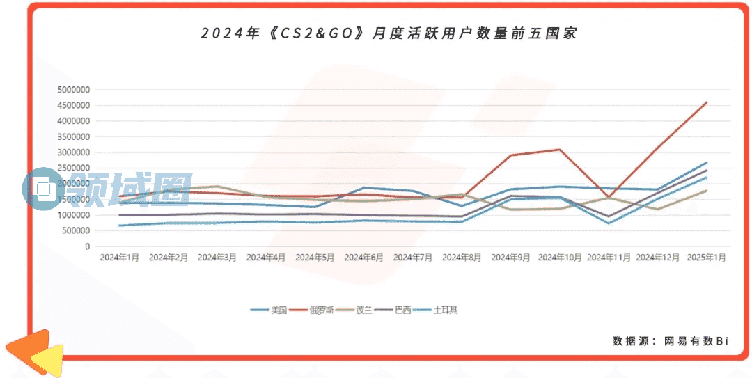 再说到世界范围内的射击游戏,以《CS2&GO》为例,这颗FPS界的常青树,美国市场虽以月均85.2万活跃玩家稳居第一,但俄罗斯、巴西、土耳其等新兴市场增速惊人——俄罗斯MAU同比暴涨187%,土耳其用户规模一年翻倍,巴西MAU突破240万。俄罗斯市场的MAU已经超越美国的267.5万的近2倍,达到459.6万。