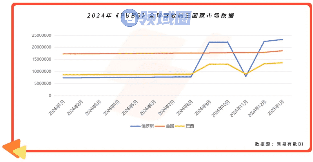无独有偶,《PUBG》的传统市场与新兴力量的角力格局愈发清晰。美国以125万MAU(2025年1月)保持领先,但俄罗斯、土耳其、巴西等区域市场实现爆发式增长——俄罗斯MAU同比激增270%,土耳其用户规模一年内翻5倍,巴西突破40万大关。这一变化背后,是新兴市场通过移动端渗透、本土化运营与低成本电竞生态对全球游戏格局的重新定义。