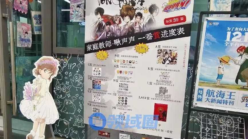 古喵的店更像是传统的动漫周边店。为防止千篇一律,店面以“神秘嘉宾”作为视觉主元素,看上去较为“吸睛”。店内主要售卖手办,多来自古喵及同伴每月的日本代购、人肉背回,这样能拿到更具稀有性的货品。店面一旁,还悬挂有镭射票等同人社团寄售物。