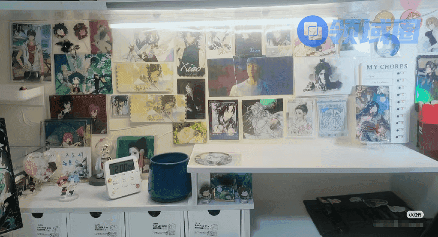 她购买了两个收纳柜,开始搭建自己的精神乐园。周末不出门时,卡皮便会收纳整理自己收藏的谷子。一面是乙游,一面是《灌篮高手》,很开心,成就感满满,她内心狂呼:“这就是朕打下的江山!”