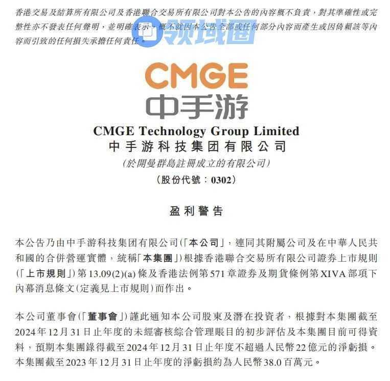 昨日,中手游发布盈利预告。报告显示,2024年度,中手游预亏损不超过22亿元,而2023年度净亏损为0.38亿元,2024年度相较于2023年度收益减少约25%至30%。