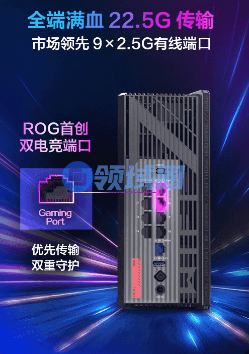 然而,ROG魔盒的魅力远不止于此。在性能方面,它更是一款不折不扣的“性能怪兽”。它配备了9个满血2.5G网口,有线传输高达22.5G。无论是PC、游戏主机还是其他高带宽需求的设备,都能轻松接入,享受无延迟的畅快游戏体验。更令人值得一提的是,ROG魔盒设有2个电竞专属端口,这也是ROG路由系列中特有的设计,这两个端口能够优先保障游戏数据的传输,确保玩家在关键时刻,始终快人一步。此外,它还搭载了强大的MTK Filogic AI CPU和2G DDR4的运行内存,提供了出色的处理能力和稳定性,无论是在网络高峰期还是复杂环境下,都能轻松应对。
