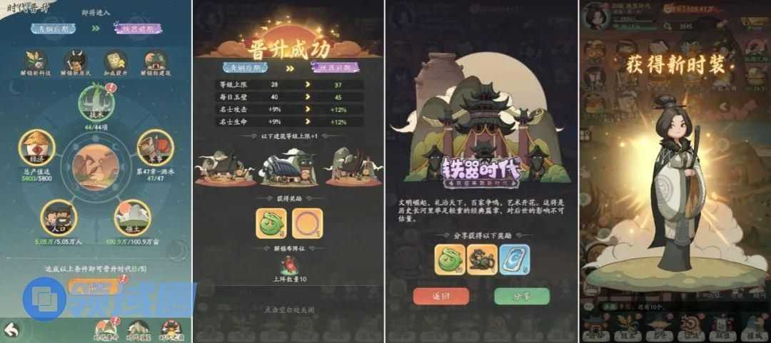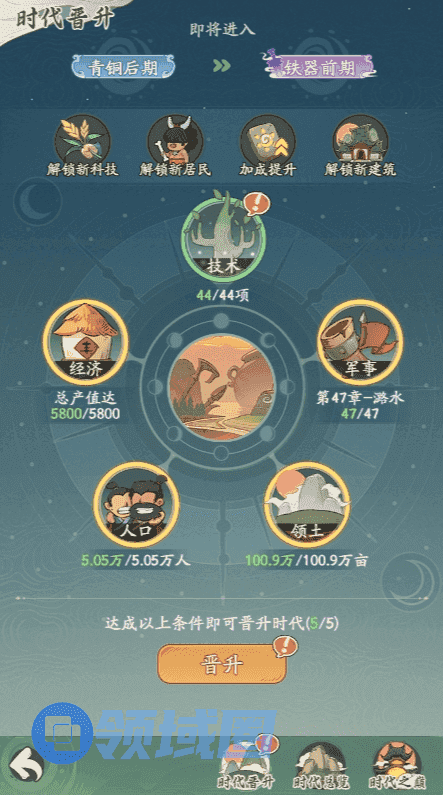 最终,当人口、经济、领土、军事、技术都达到一定的标准之后,即可晋升到一个新的时代,继续下一阶段的数据增长和征战轮回。