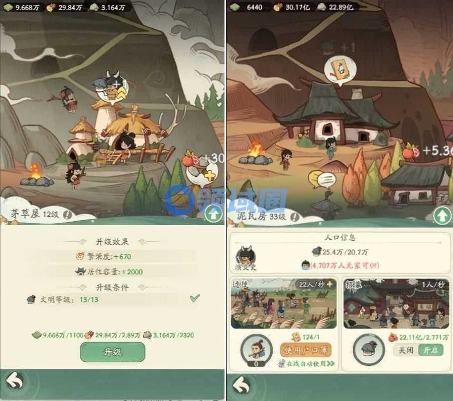 进入游戏后,玩家需要对生存建筑进行持续升级,从早期的帐篷,到茅草屋,再到后来的泥瓦房、砖瓦楼,不断提升领地居住容量,同时使用户口簿资源吸引人口迁移,或者通过自动招募的方式持续增加人口规模。