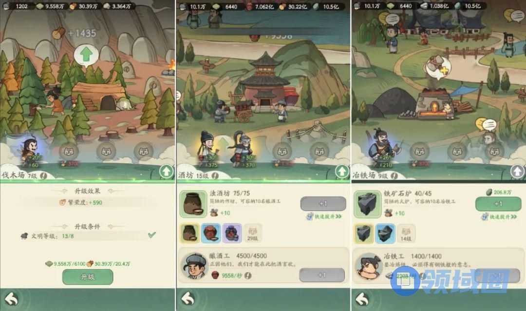 随着人口的持续增长和时代的不断发展,玩家还将逐渐解锁伐木场、农场、采石场、铜矿场、冶铁厂、酒坊等众多生产建筑。只要向这些建筑中派入工人,系统就能按照一定效率产出对应的基本资源和经济资源,形成主要的经济生产力以供领地生存、升级所需。