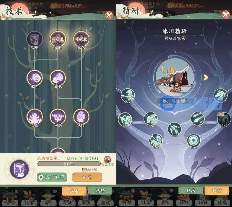技术部分主要分为研究和精研两种模式。其中技术研究需要耗费一定资源和时间,每次只能研究一种技术,玩家可以使用加速卡提升研究效率,完成后可解锁新的内容,或对产能带来更多加成效果。