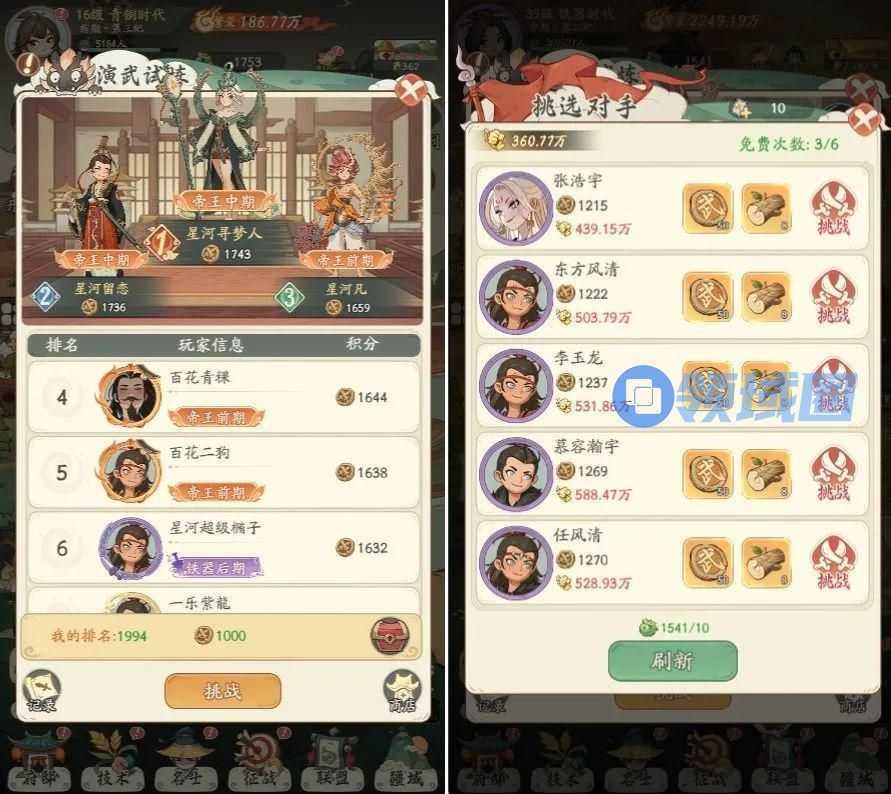再比如除了征战,玩家还可以通过演武试炼(PVP)和时光裂缝(爬塔)两个模块,对名士养成效果进行实战验证。玩家使用挑战次数,即可挑选指定对手进行演武试炼,胜利后,即可获得对应的资源和积分奖励。