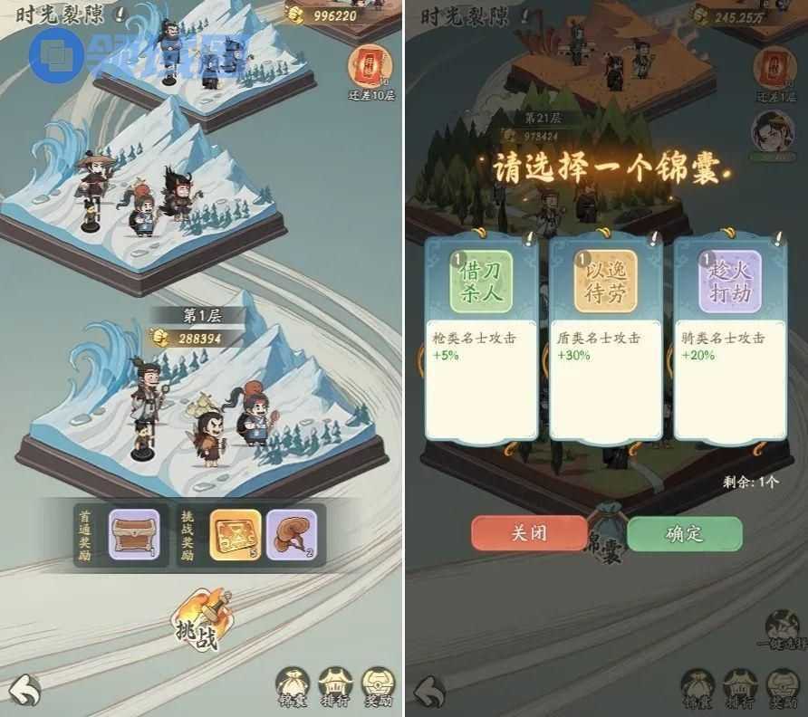 时光裂缝则分为多个层级,玩家通过一层挑战后,就能获得对应奖励,并进入下一层。通过10层后,还可以选取一个锦囊,对挑战过程进行战力加成。