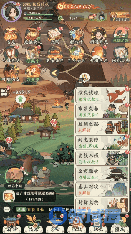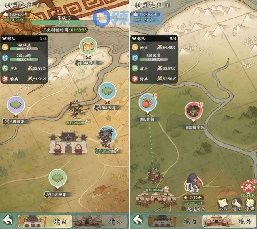 完成征战关卡后,不仅军事数值会得到提升,还能获得一定领土奖励。领土也是时代发展的重要要素之一,除了征战之外,玩家还可以使用地契,或者通过远征、巡视玩法获得更多领土资源。