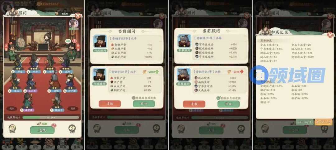 还有大热的“开箱子”玩法,干脆也被包装成了“顾问选拔”。10个居民数量对应1次选拔机会,玩家可以通过选拔,选出科技顾问、教育顾问、行政顾问、军事顾问等12位顾问,对名士属性和资源产出带来更多加成。