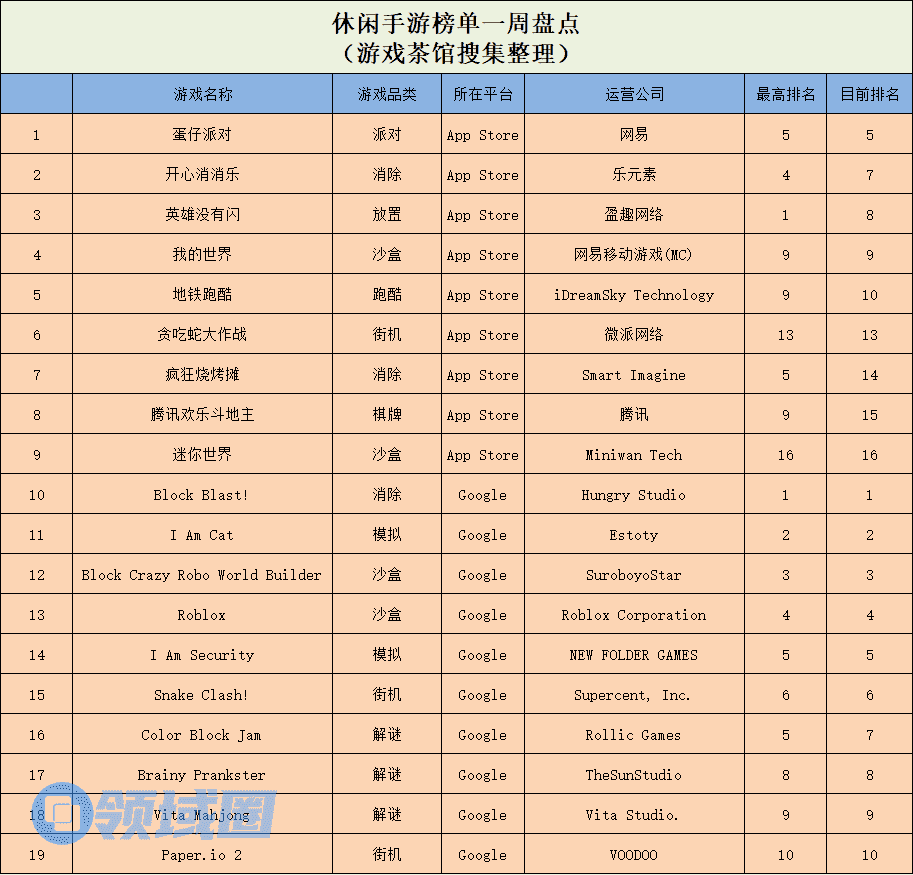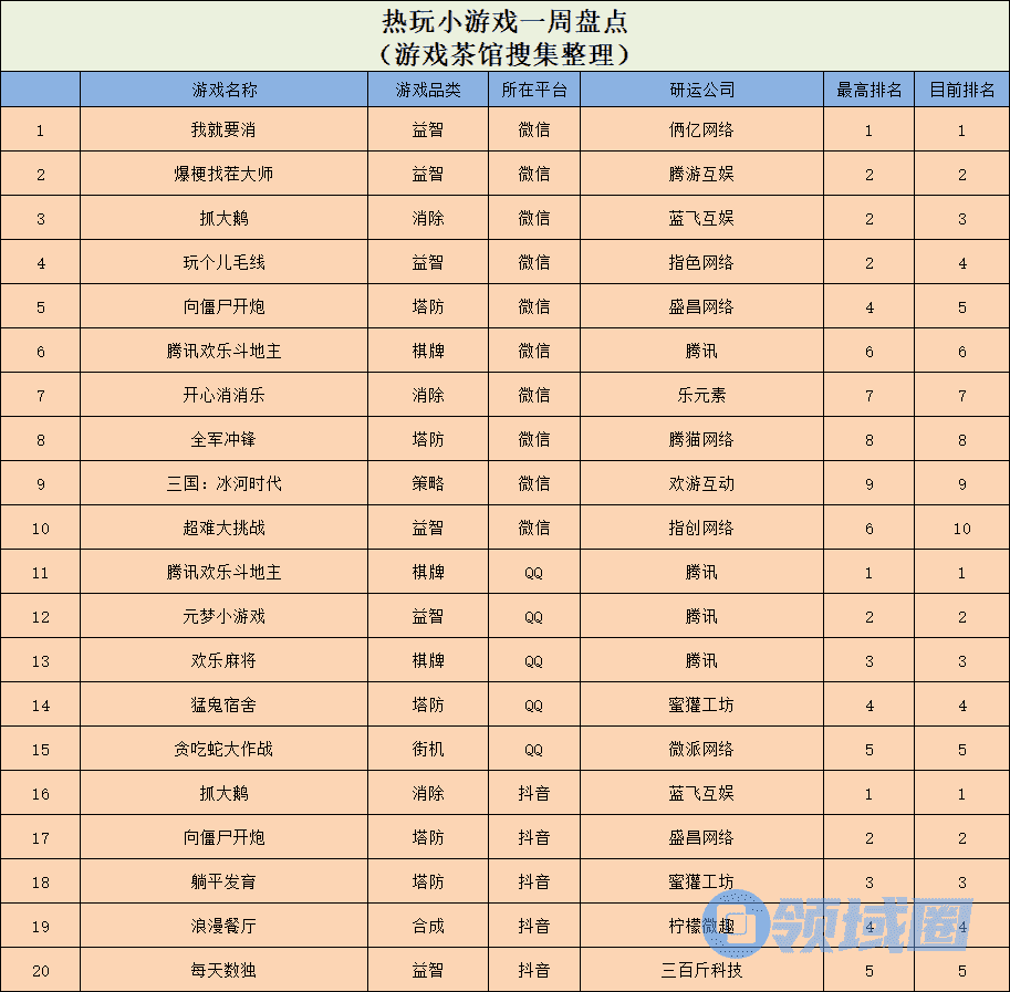 休闲新游周报每周统计微信小游戏、QQ小游戏、抖音小游戏、硬核小游戏以及App Store和Google Play上的新游爆款,并按照分类制作表格,将游戏排名情况等信息进行整理,希望给到行业同侪帮助。