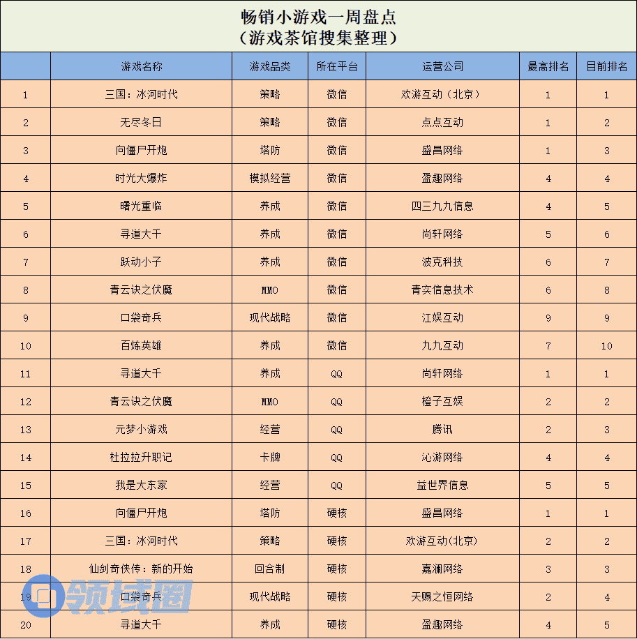 在硬核小游戏畅销榜单中,大梦龙途的塔防小游戏《向僵尸开炮》又一周稳坐畅销榜魁首席位,三国SLG《三国:冰河时代》和回合制玩法的《仙剑奇侠传:新的开始》紧随其后,分别拿下榜单第2和第3名。同时,来自三七互娱的“开箱子”游戏《寻道大千》本周继续以超高热度,拿下榜单第5名。