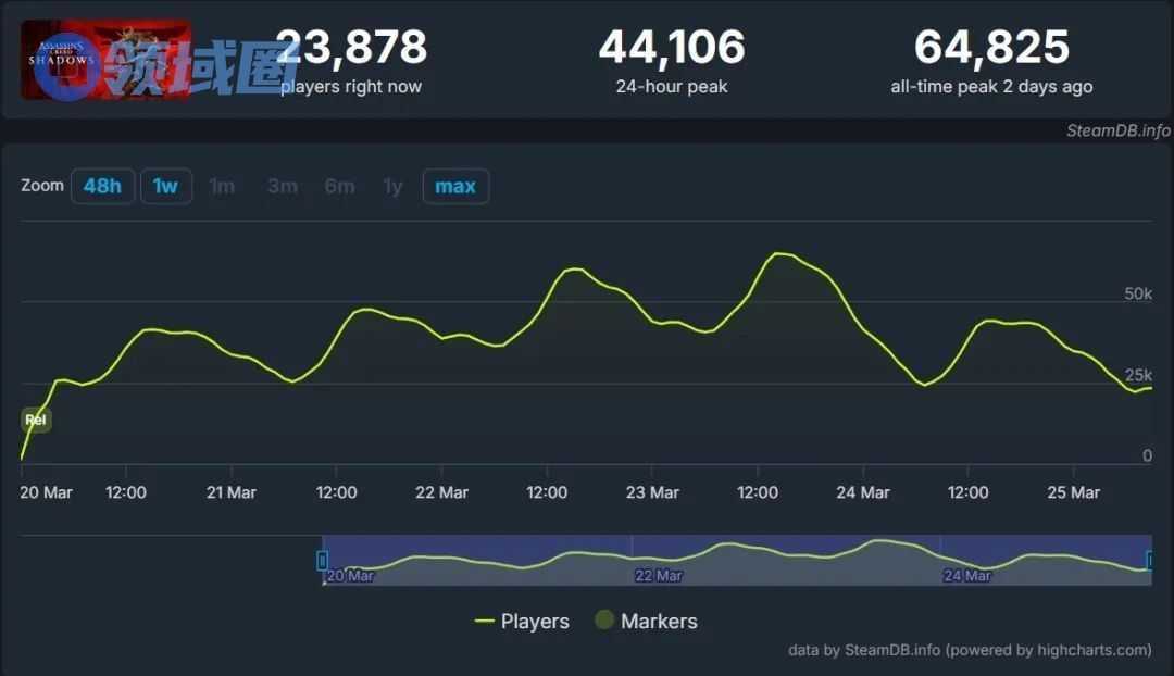 截止到目前,《刺客信条:影》在Steam上的最高同时在线玩家人数达到了6.5w,好评率为81%。在三天前,官方就官宣其玩家数量突破200w,与系列作品《起源》和《奥德赛》的同期数据相比,《影》的玩家数量竟然排到了第一。