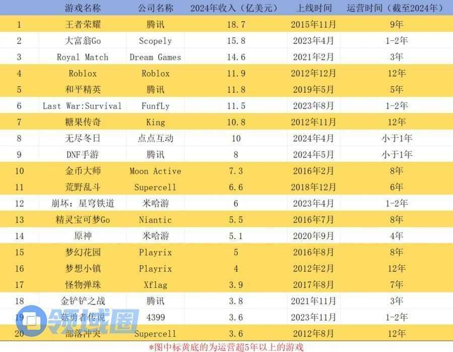 据Appmagic统计,2024年全球收入最高的20款手游中有14款游戏运营时间在2年以上,其中有11款游戏运营时间超过5年,这些老游戏通过持续的内容更新、精细化的用户运营和成熟的商业模式,占据了市场大部分份额。