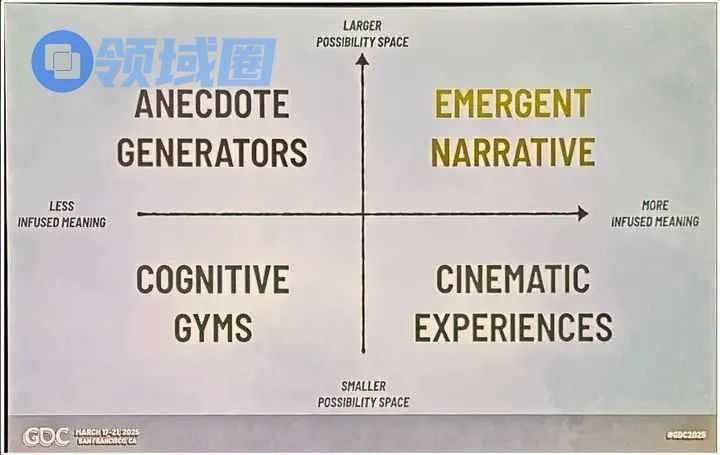 关于游戏意义生成的概念框架:横轴代表“意义注入量”,纵轴代表“可能性空间的大小”,而《Frostpunk 2》正是朝着右上角“创发性叙事”的方向设计。