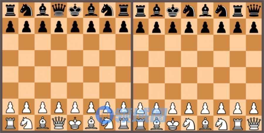 左:国际象棋的标准开局;右:Chess960的某种开局(最后一排棋子被打乱了顺序)