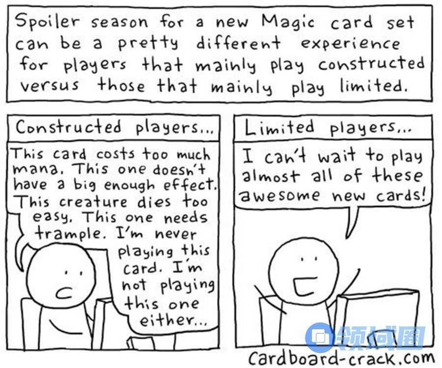 《万智牌》的设计师Mark Rosewater表示,他和很多职业牌手交流过,他们当中大部分认为限制赛(Limited,从随机卡包中选牌)比构筑赛(Constructed,从自备卡包中选牌)更考验技巧,因为前者需要玩家对卡牌有更全面和深入的理解,才能随机应变并取得胜利
