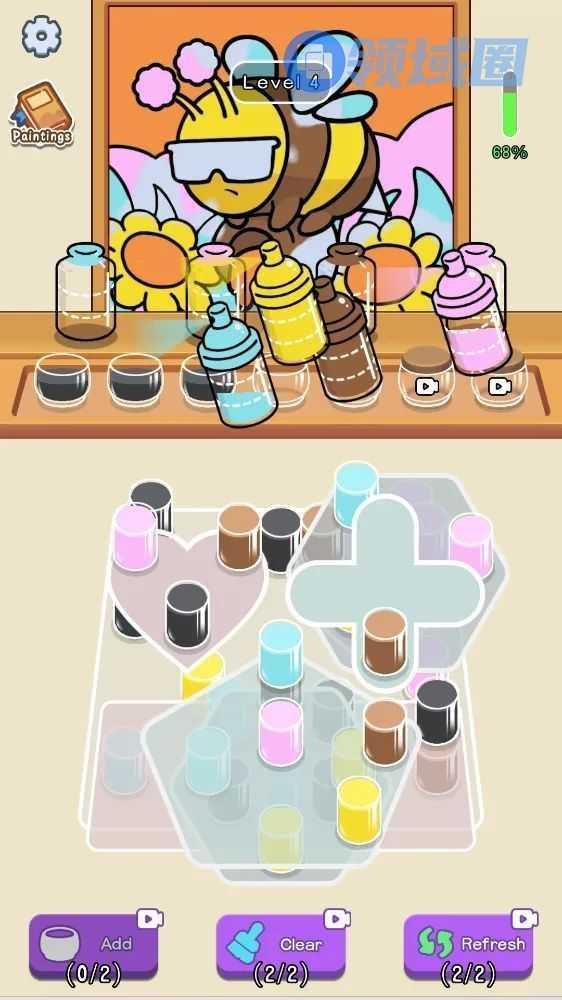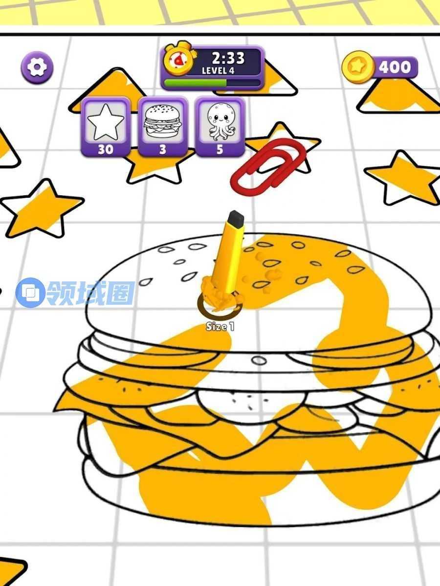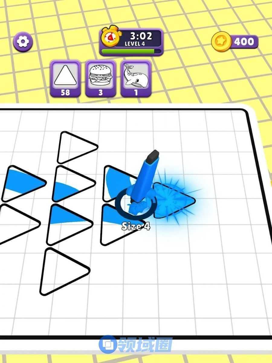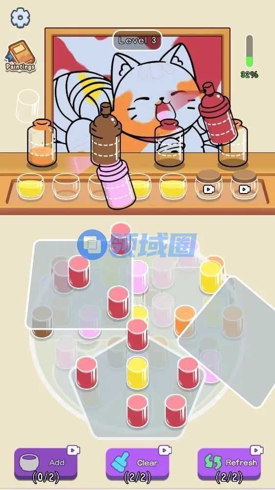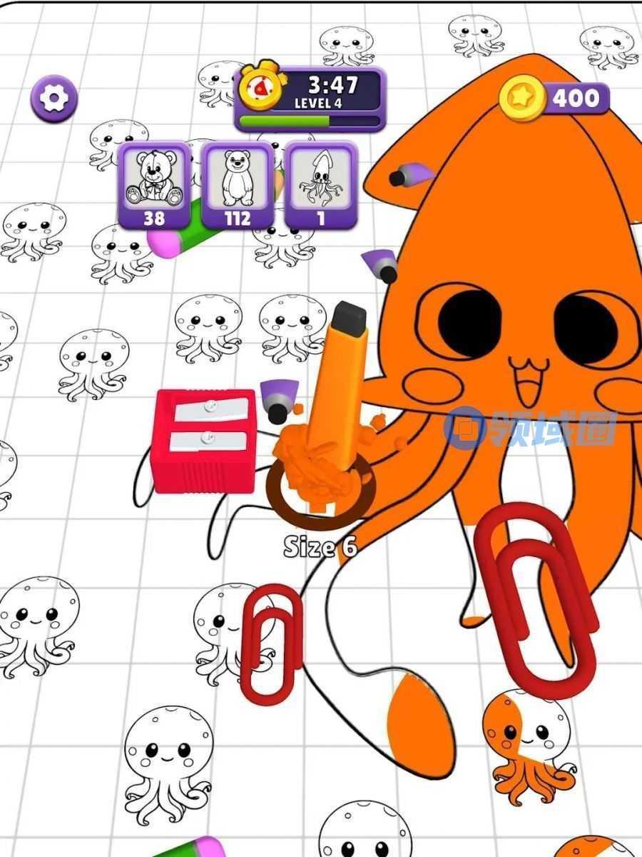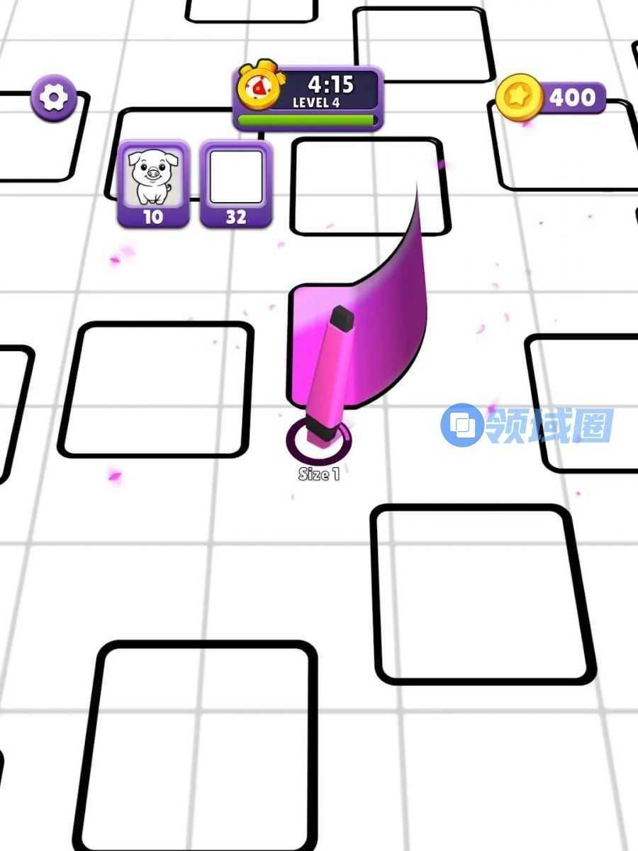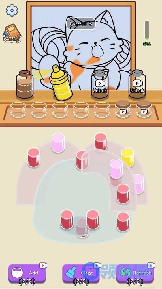 这款做了点题材上的变化,把“黑洞装东西”的表现形式换成了“画笔涂颜色”,尽可能的在大DAU品类里做题材替换,用一套关卡和核心机制表现玩法,换不同题材去做尝试,这款有点意思,但感觉也还有很大的空间,涂色的表现和ASMR其实远比这款游戏表现的广度和深度多得多。还有很多提升空间。