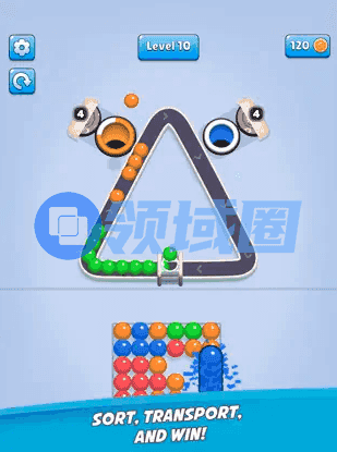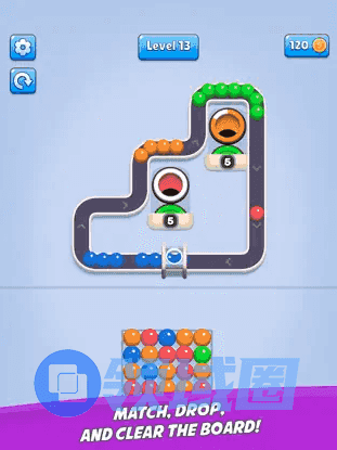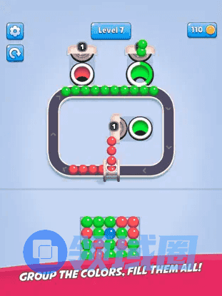 介绍:玩家在底部区域内点击消除各色球,然后会送到中央的传送带上,把球送入各个颜色的球洞,小球对球洞类似于单个Tile跟对应槽位的关系。然后玩家要在传送带堆满之前,把所有小球放到所有球洞之中。