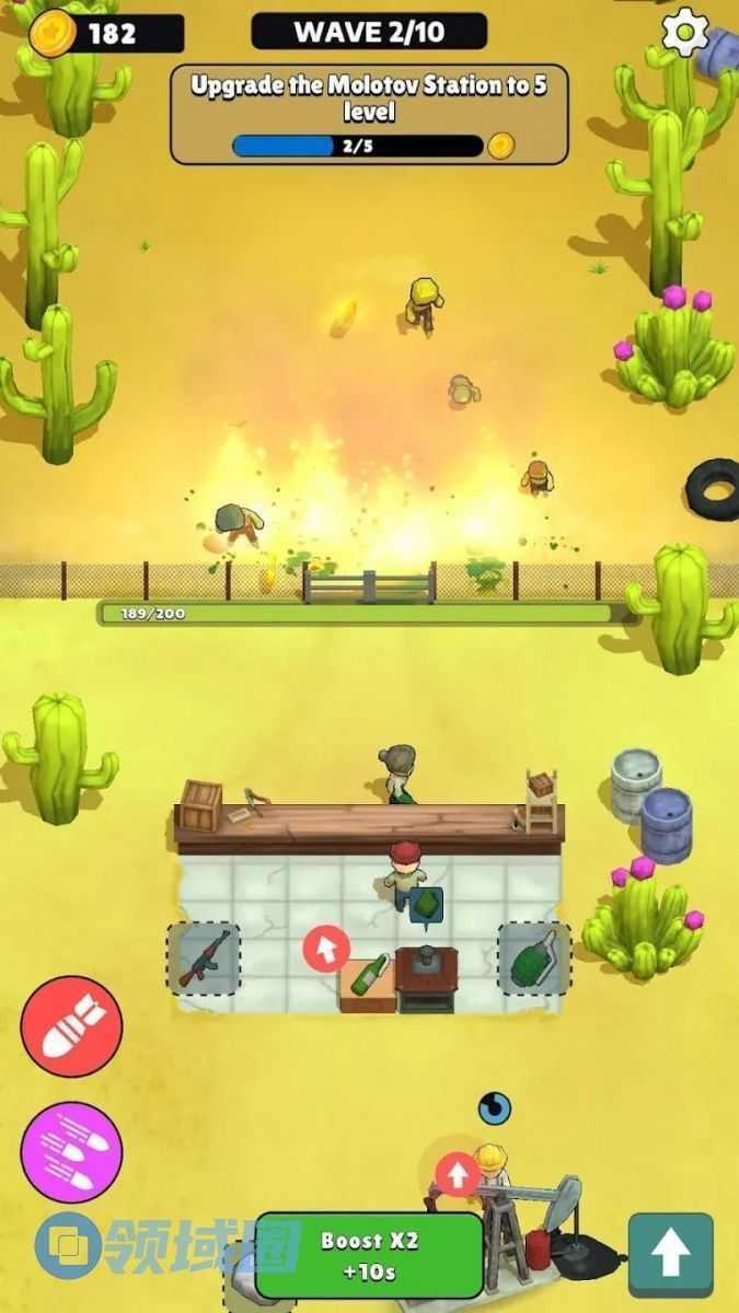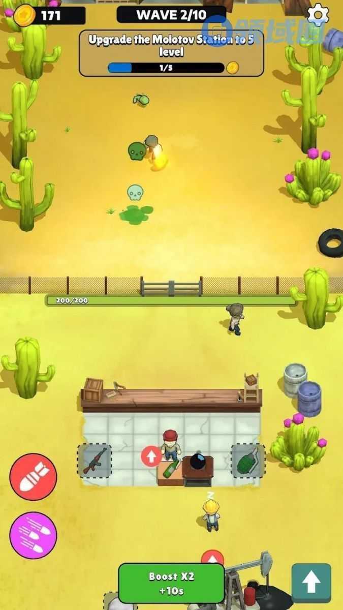 介绍:又是一款模拟经营+放置防守组合的题材,模拟经营部分采用的是类似《Eatventure》形式,玩家在底部进行资源采集、建造武器、分配武器给防守队员的放置流程,防守队员拿着建造好的各种武器抵御上方来袭的敌人。