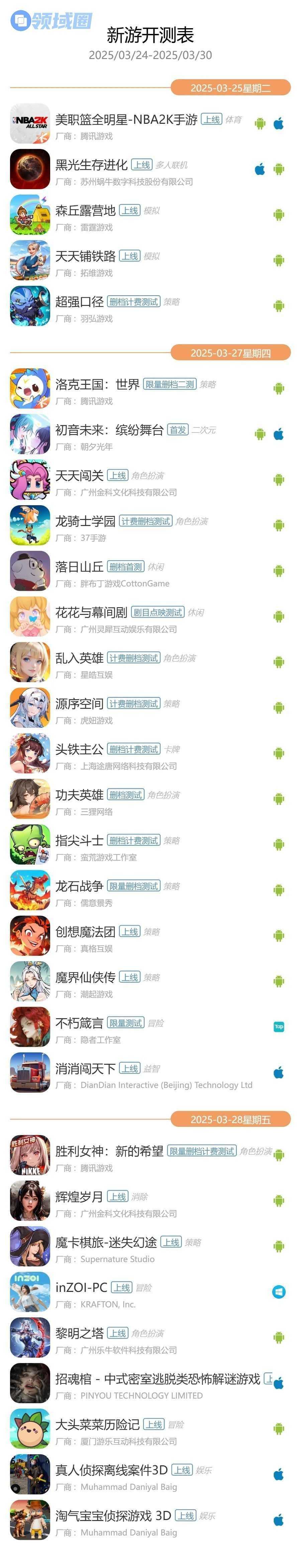 GameRes游资网统计了2025年3月24日—2025年3月30日的最新手游开测信息,共有30款游戏开测。以下是开测信息: