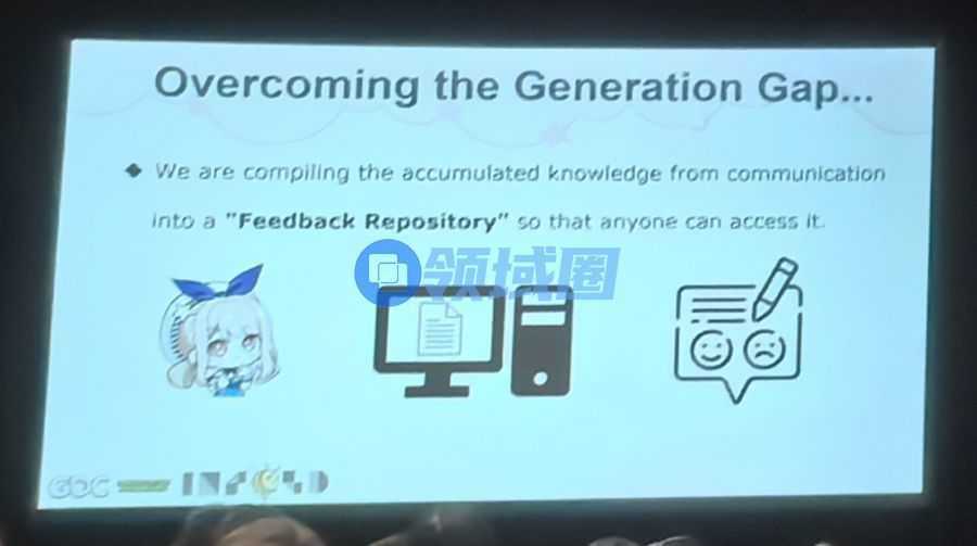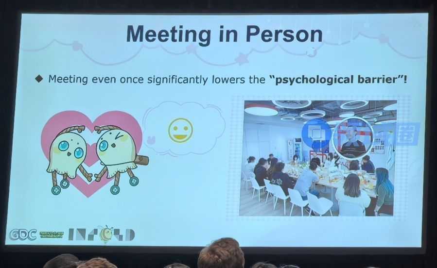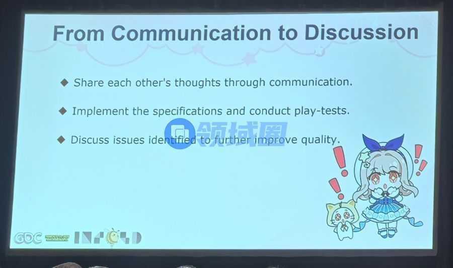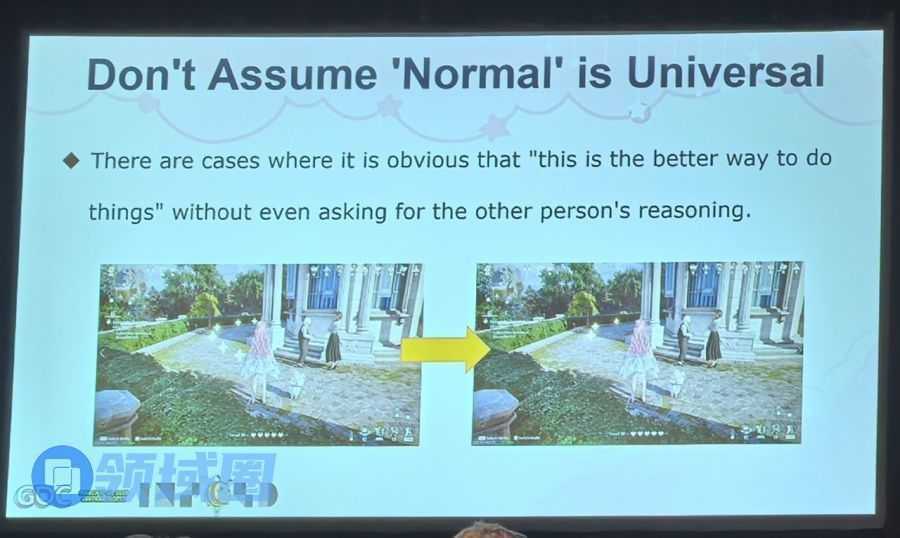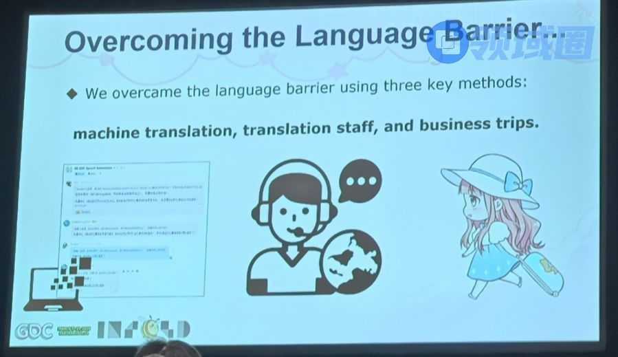 冨永健太郎当然是和团队一起克服了语言障碍和代际差异,不仅培训年轻关卡设计师,也成功完成《无限暖暖》的开发。他也讲这一过程完整地进行了回顾,其有三个关键点:“翻译”、“沟通”和“讨论”。