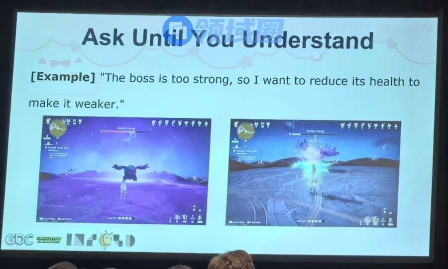 他举了一个简单的例子,一位设计师提议:“Boss太强了,我们应该降低它的血量。”但削弱Boss的方法有很多——降低攻击力、减慢移动速度等。他会提问:“为什么选择降低血量?”