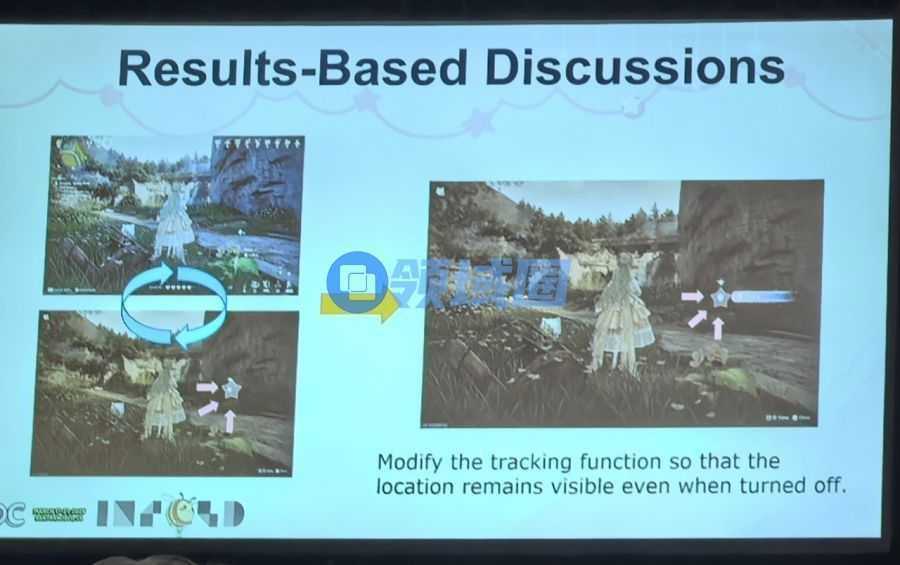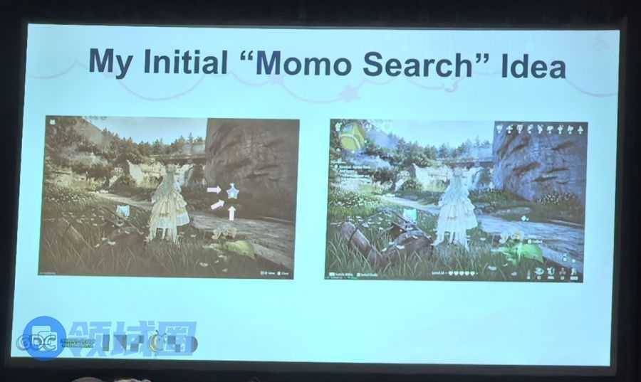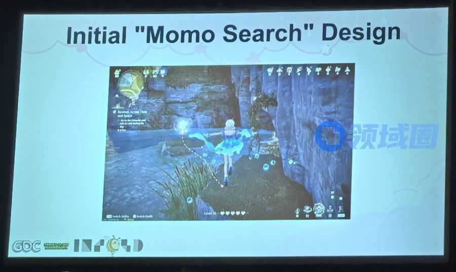 他分享了一个游戏开发中的实际案例,《无限暖暖》中有一个关键物品叫“奇想星”,收集这些星星可以让玩家解锁新的服装设计和能力。团队对此设计了一个搜索功能,来鼓励玩家收集更多的星星。这也促成了“大喵视野”功能的开发,大喵会帮助玩家定位奇想星:【大喵首先会提醒玩家附近有奇想星。当玩家激活大喵视野时,会出现一个图标,标明星星的方向。如果星星在可见屏幕范围内,它会发光——即使它藏在墙后。一旦星星被标记,即使关闭大喵视野,其位置仍然可见。】