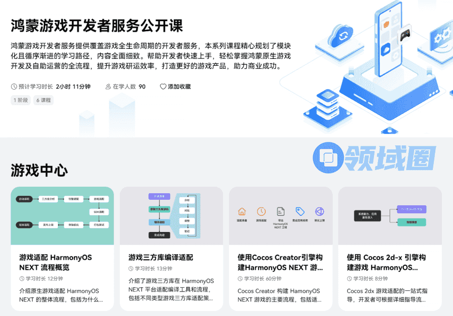 首批上线的课程包括游戏适配HarmonyOS NEXT流程概览、游戏三方库编译适配,以及使用Cocos Creator、Cocos 2d-x、Laya引擎构建鸿蒙游戏的一站式指导,开发者可根据详细指导流程,完成鸿蒙游戏的顺利适配。除此之外,课程专区还上线了鸿蒙小游戏开发接入指南,介绍鸿蒙小游戏的主要基础能力和开放服务。