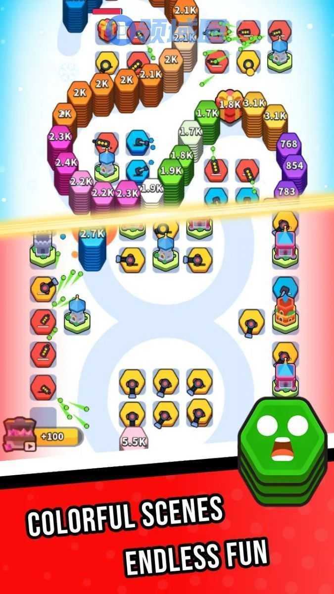 介绍:近期超休闲往中度做的产品越来越多了,这款就是这种思路,把《Hexa Sort》的简单消除堆叠玩法,通过增加了一个防御敌人防守的规则,变成了双玩法循环,玩家先用sort玩法攒兵,然后造兵防守来袭的敌人,sort堆得越高兵种等级越高,数值就越好,然后增加了简单的不同兵种不同属性,但是策略感并不明显。