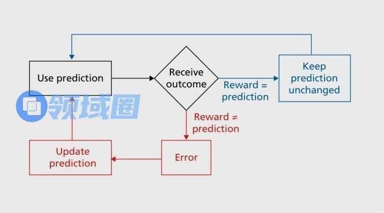 生物需要不断调整对事物的预测以适应多变的环境。奖励预测误差假说(reward prediction error hypothesis)认为,多巴胺起着奖励预测误差的作用:当实际获得的奖励和预测获得的奖励存在差异时,多巴胺会促使生物更新预测和改变行为(红色部分),直到实际获得的奖励和预测获得的奖励相等,生物才会停止(蓝色部分)。这个最小化预测误差的过程,就类似于消除不确定性的过程