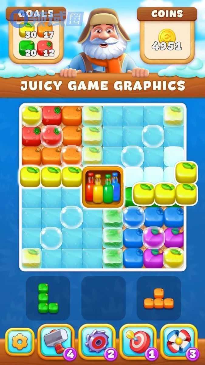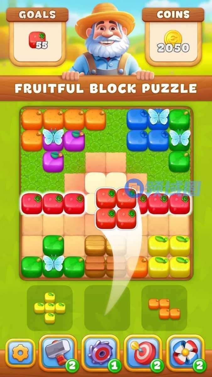 介绍:近期看到的完成度最高的Block Puzzle类游戏了,忘记之前看没看过它的原型了,但我简单搜了下没搜到,用各种水果蔬菜包装了各色砖块,然后在每关达成关卡的玩法,障碍设计也和玩法比较搭,外围套了个Royal Match的建造,以及一些休闲消除类的各种连胜、累计、排行榜的各种活动矩阵。